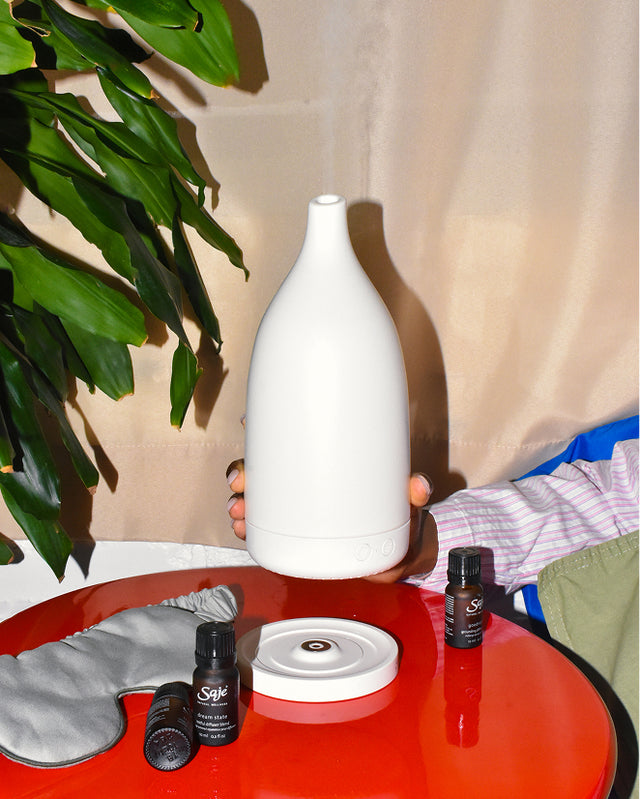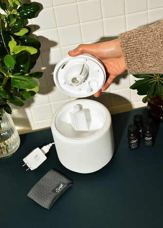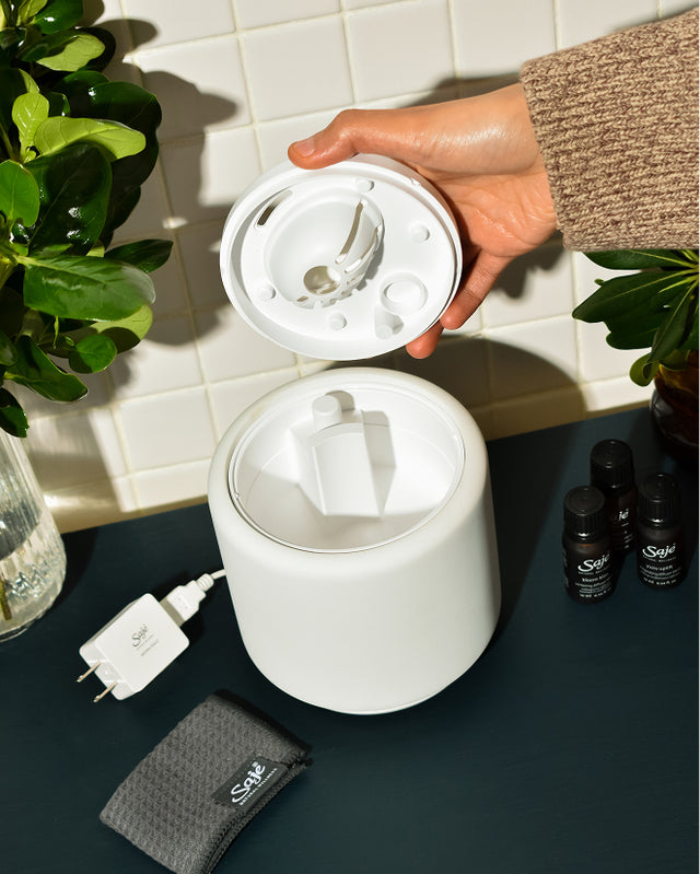 Every Saje diffuser breaks down water molecules into a fine, cool mist that’s packed with negative ions, neutralizing pollutant aggressors and enhancing well-being. Adding 100% natural essential oil blends allows the power of aromatherapy to target your wellness needs and create a pleasant aroma in the air.